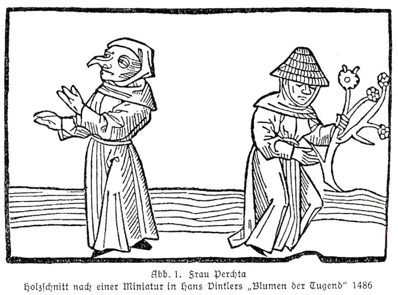 In Alpine areas, Frau Perchta flies abroad during the 12 nights between Christmas (Dec. 25) and Epiphany (January 6). She reputedly punishes reluctant feasters—as well as the lazy, untidy, or disobedient—by making the punishment fit the crime: she disembowels them and replaces their guts with rags, trash, or splinters. (Some say a belly full of food will deflect Perchta’s blade.) Like many mythic figures she is associated with the Wild Hunt motif (a night ride across the sky, here accompanied by a retinue of lost souls/unbaptized children). Historically, and like Scotland’s gyre-carling, Perchta also regulated cloth production, making sure that spinners worked and rested at appropriate times.